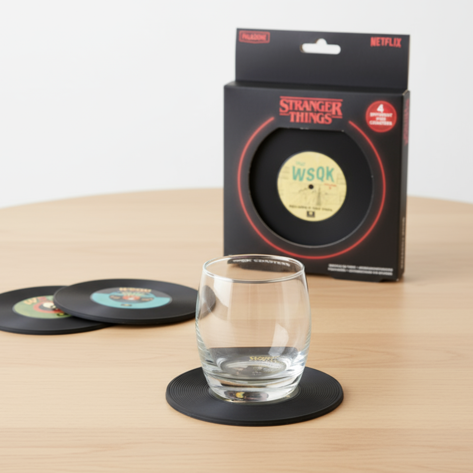 Protege tus superficies con estilo ochentero usando este set de 4 portavasos Stranger Things con forma de discos de vinilo. Inspirados en la estación de radio ficticia WSQK de Hawkins, son el complemento perfecto para fans de la serie.