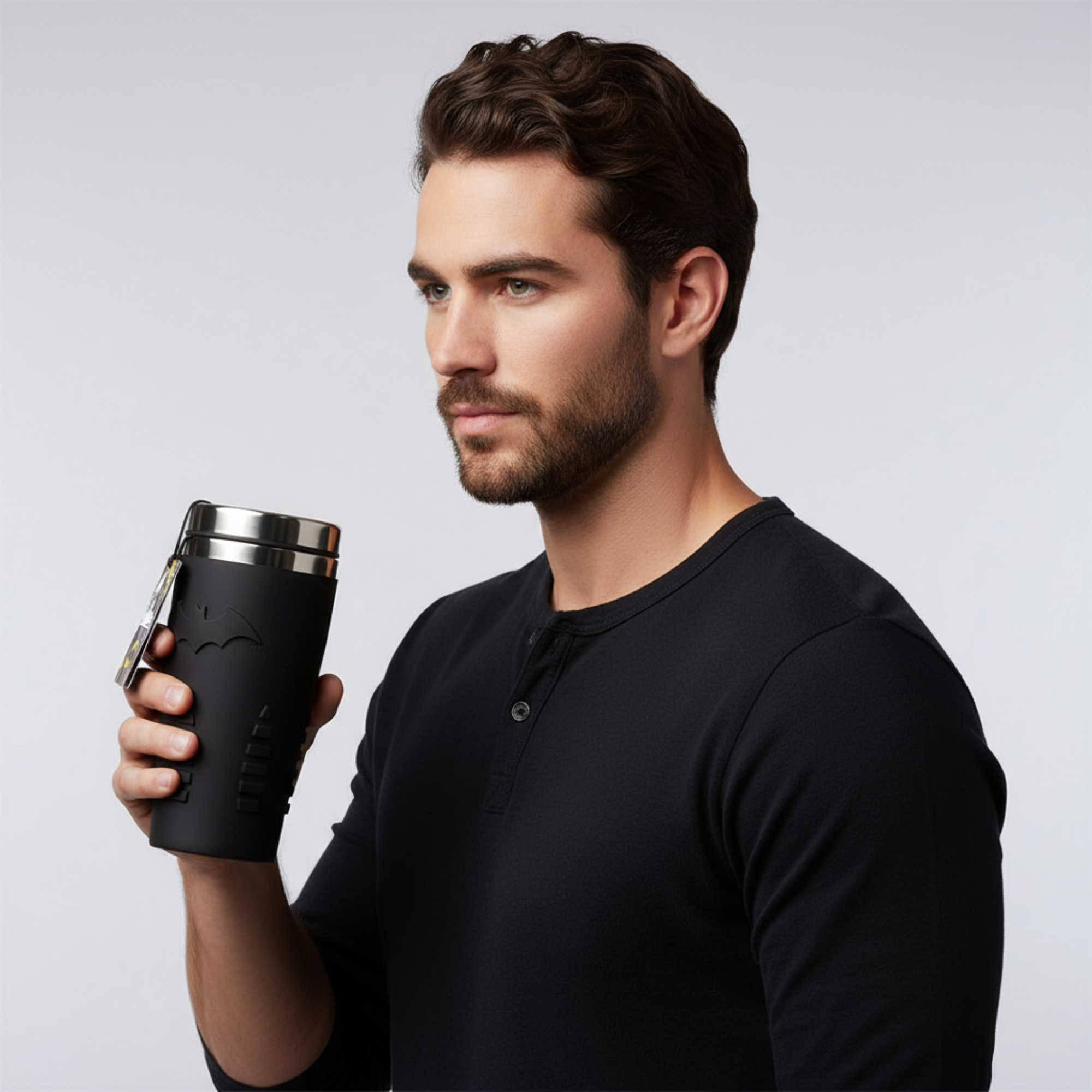 Lleva tu bebida favorita con estilo con este termo de viaje oficial de Batman™. Su diseño elegante en negro con el logo del Caballero de la Noche y su recubrimiento antideslizante lo hacen perfecto para los verdaderos fans de DC.
