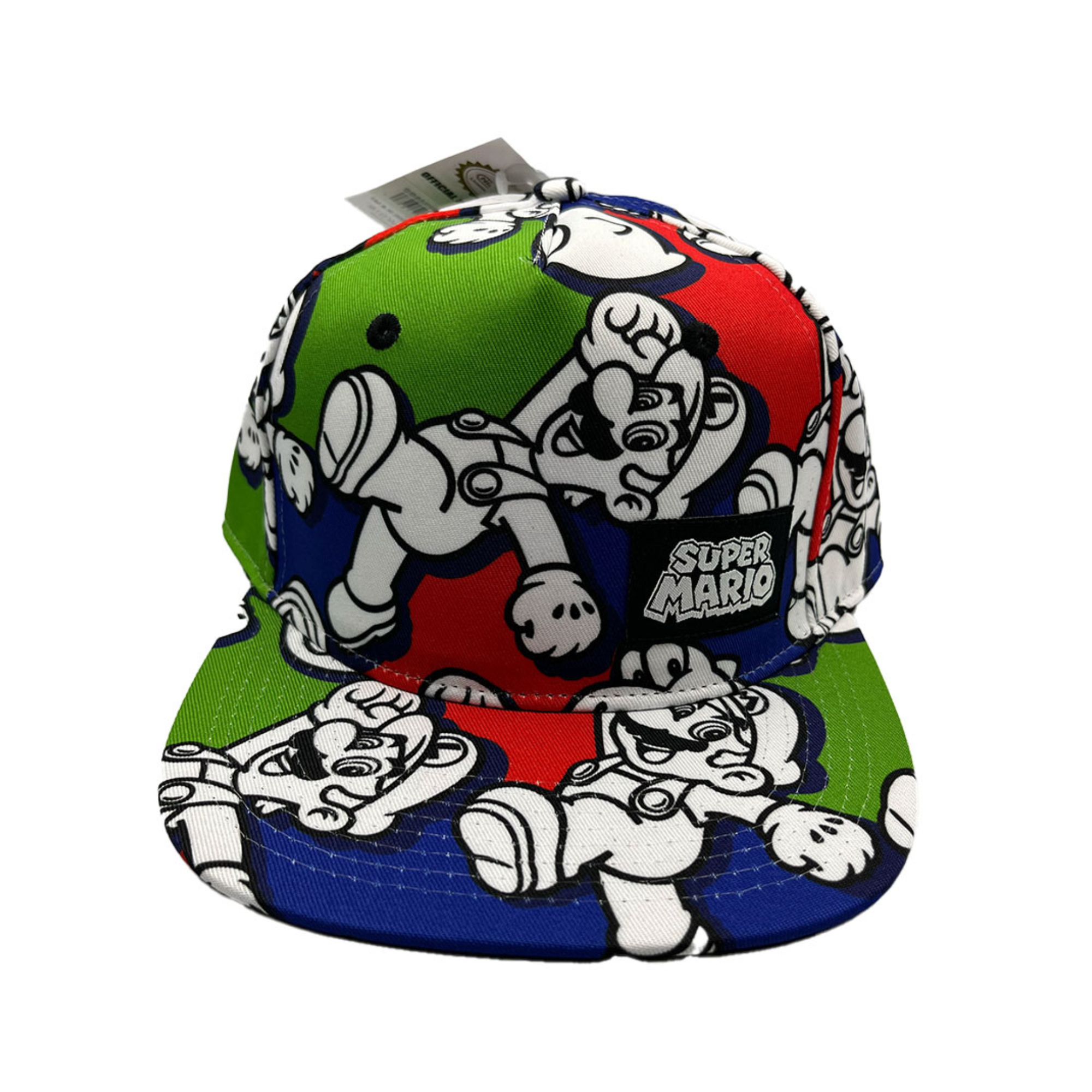 Diseño bordado de alta calidad: la corona tiene un diseño de collague de Mario y Luigi Jumping por toda la gorra en blanco y negro con un fondo en tonos verdes, azules y rojos.