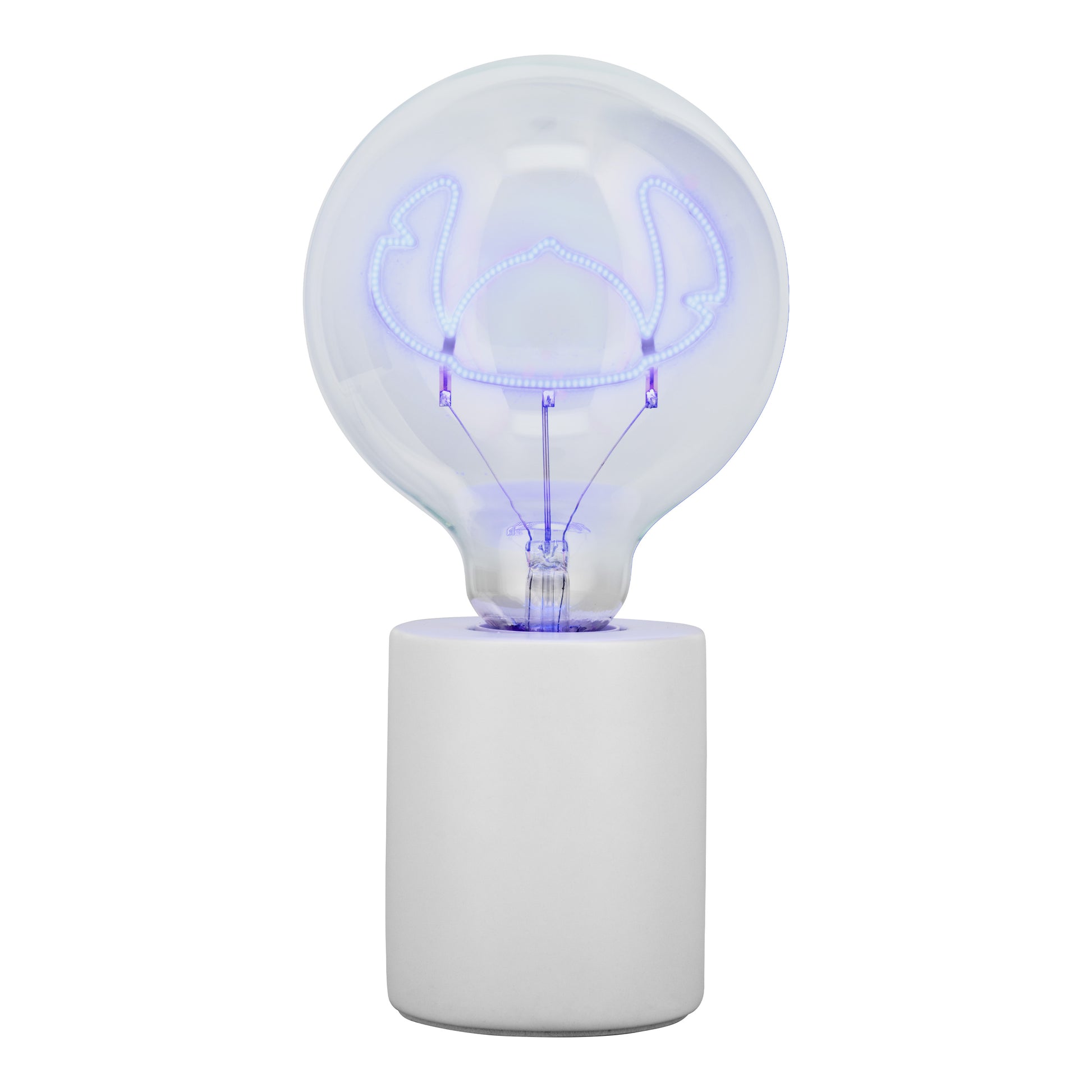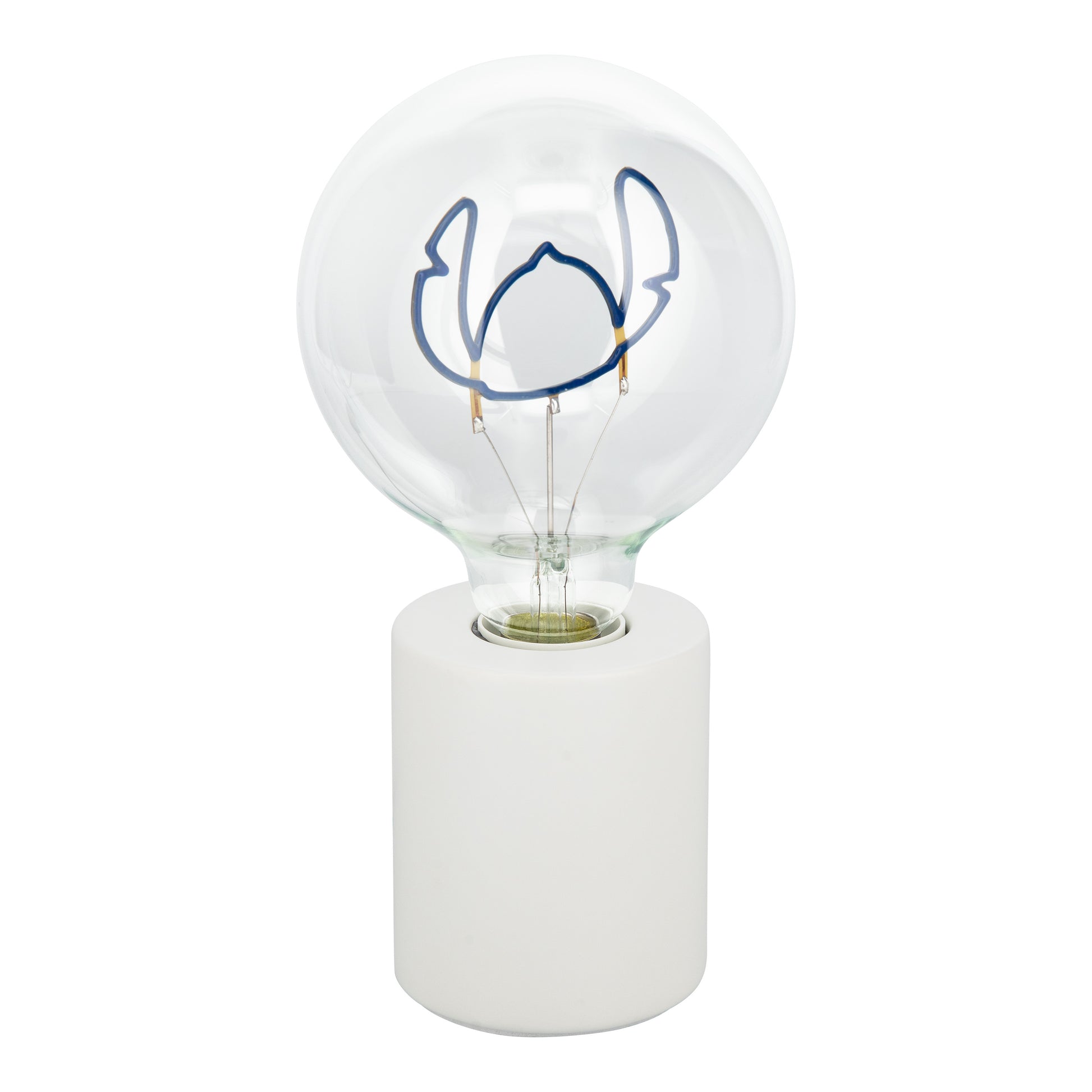 Lámpara de bombilla LED neón de Stitch de Paladone. Con un diseño innovador, esta lámpara presenta la silueta de Stitch iluminada en un vibrante tono azul, dentro de una bombilla de vidrio G125. Su base de cerámica le da un acabado elegante y resistente, mientras que su conexión a corriente la hace ideal para colocar en cualquier espacio sin preocuparte por baterías.